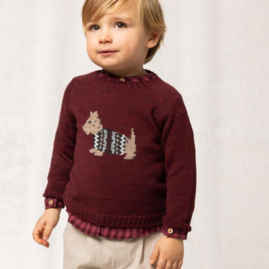 • Sold at Bombon shop, designed by Fina Ejerique, a burgundy knit baby sweater with a dog motif in a houndstooth sweater.front