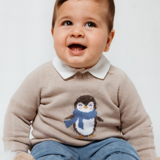 • Sold at Bombon shop, designed by Fina Ejerique, a beige knit baby sweater with a penguin motif wearing a blue scarf. front