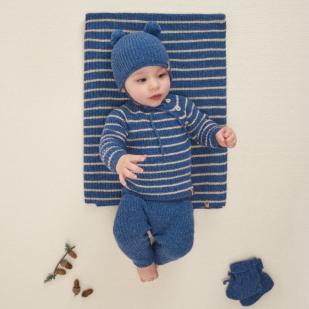 The Nogal Striped Knit Set by Paz Rodriguez offers a timeless nautical look with a cozy twist. This two-piece set features a beautifully textured blue knit with classic cream stripes and thoughtful shoulder button details for easy dressing. The matching pants provide comfort and warmth, making it an ideal outfit for cooler days at home or out and about. A wardrobe staple with European charm.