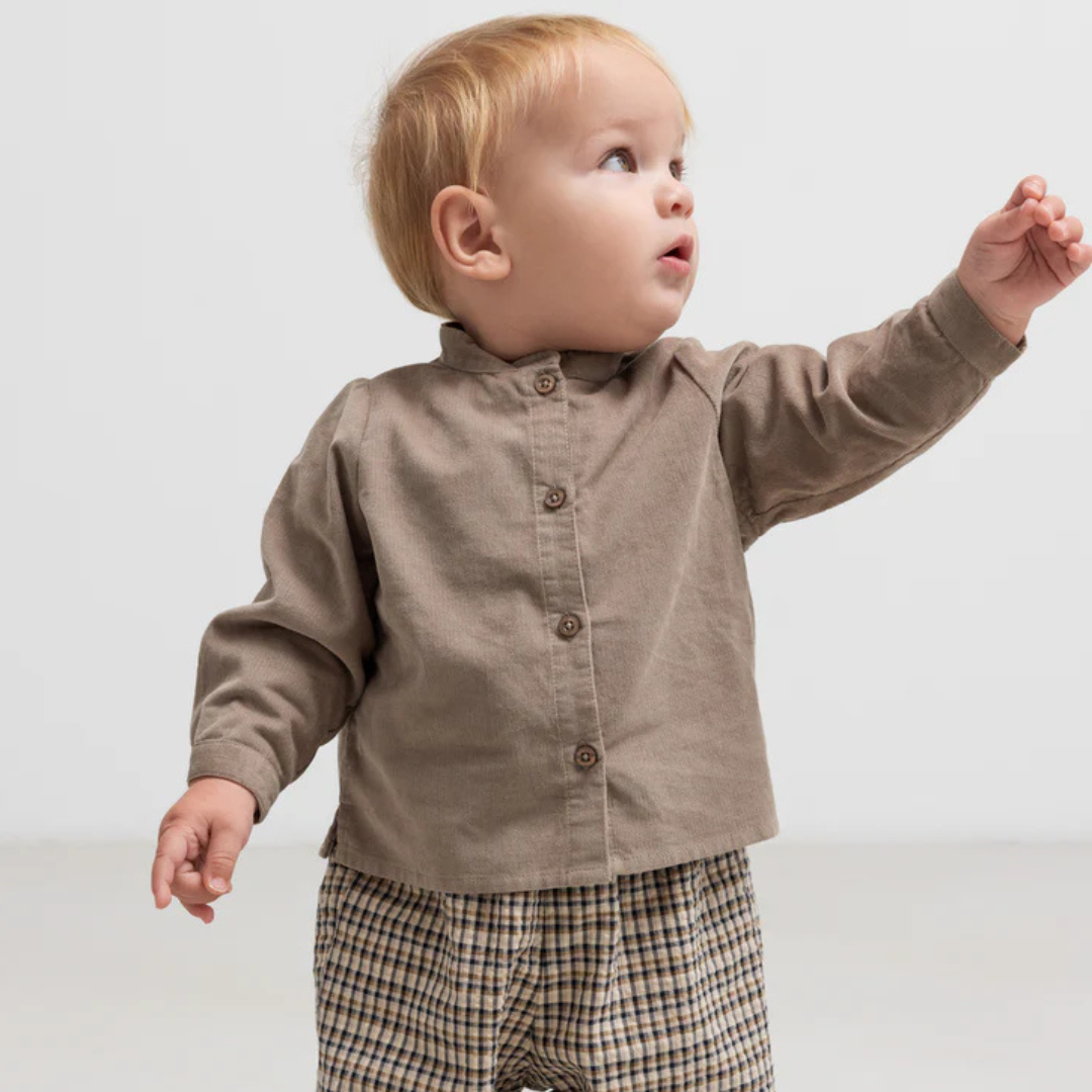 A timeless beige shirt from MarMar Copenhagen crafted in soft, lightweight cotton. Featuring a mandarin collar and button-down front, it brings understated Scandinavian elegance to your little one’s wardrobe. Comfortable and versatile, it’s perfect for both everyday wear and special occasions. Pair with the matching check pants for an effortlessly refined look.